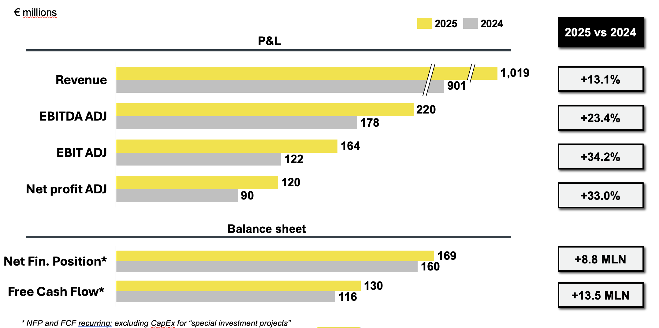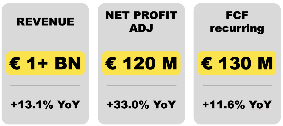 L’EBITDA adjusted è salito a Euro 178 milioni (+17%), facendo registrare anche il terzo anno consecutivo di incremento dell’EBITDA adjusted margin pari al 19,8%, considerando il 17,5% del 2021, il 18,3% del 2022 e il 18,8% del 2023. L’utile netto adjusted cresce del +15% a Euro 90 milioni, migliorando la profittabilità del gruppo ora pari al 10% dei ricavi, contro il 9,7% del 2023.